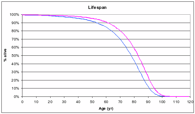My own plot, based on actuarial data from the US Social Security Administration.4 For women (pink), the curve shifts to the right by 5.3 yr., compared to men (blue). Life expectancy at birth for men (born in 2002) is 74.2 yr.; for women it is 79.5 yr.